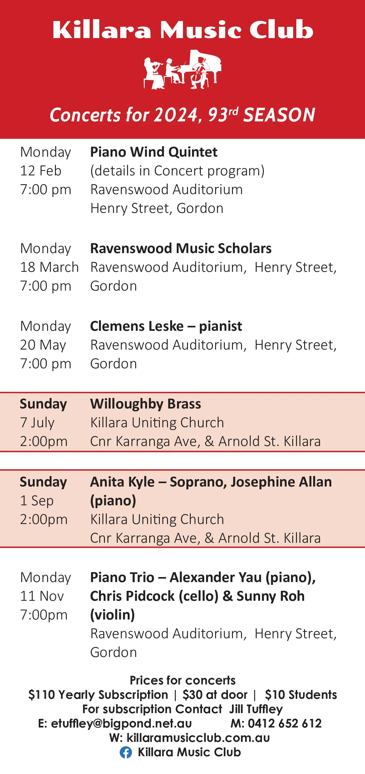 Two of the concerts were held on Sunday afternoons at the Killara Uniting Church, starting at 2.00pm. Afternoon tea was included. These concerts were so popular that the committee decided to continue that format in 2025: two Sunday afternoons and four Monday evenings.